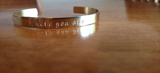 A couple weeks ago I started wearing a little brass bracelet (Etsy!) that I had stamped with the words there you are. I wear it turned toward me, and those three little words give me three big messages: